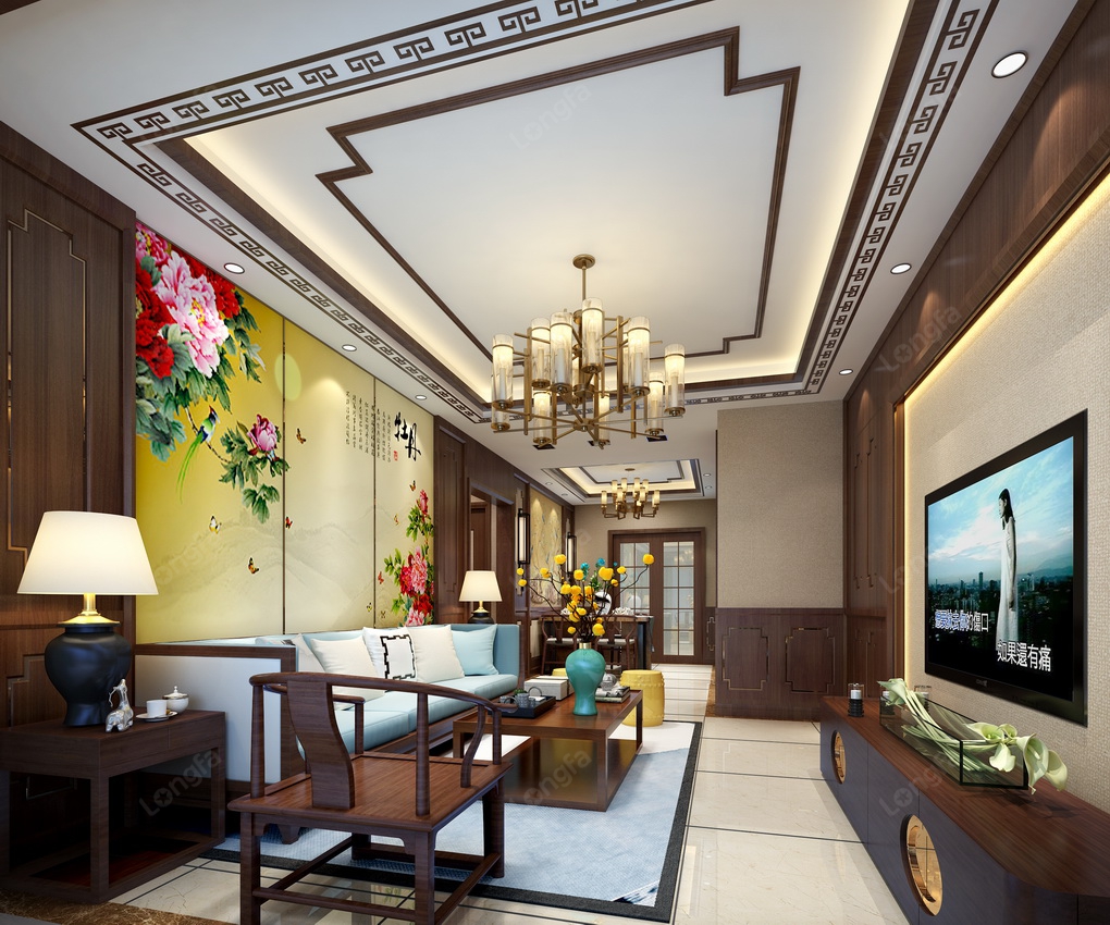 中式装修风格则是讲究对称,材质上选用电视背景墙单色壁纸加护墙板形式,及沙发背景墙护墙板加艺术壁纸增加中式气氛。