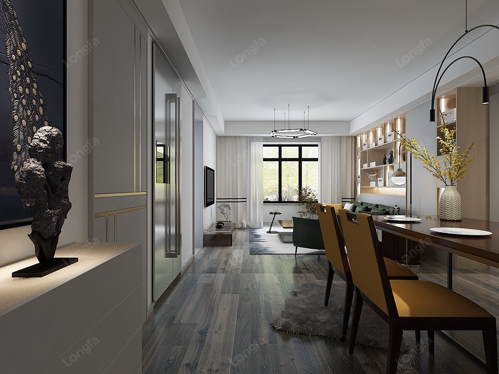 客厅沙发墙做了一整面的书柜,为使空间更有拉伸感,柜子格局设计也更重承重能力和横向拉伸感。