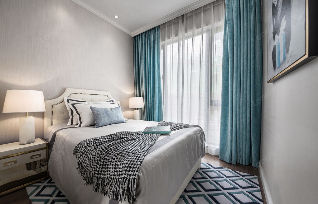 沙发背景墙上蓝灰色墙布与美式线条组合,让整个空间更加丰富。