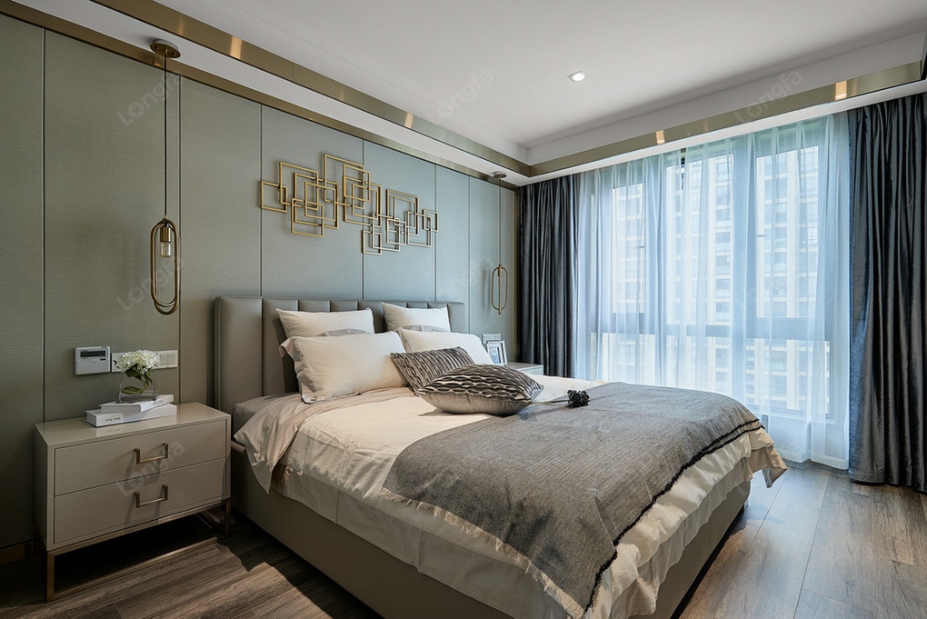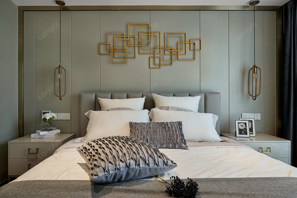 床头背景墙运用定制造型板,搭配上简单的线条,整体颜色偏暖色系,让空间更加的舒适。