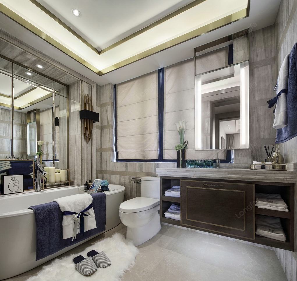 灰色白色的地砖搭配深色波打线条,整体偏黄色系的基础上搭配上蓝颜色的跳色