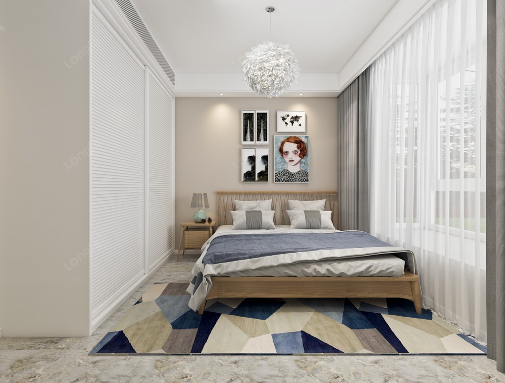 主卧作为居家休息的主要活动区域,以舒适和简约为主,为了更好的睡眠空间卧室并没有采用跟动态空间一样的明亮空间。而是采用暗色系主打宁静祥和的氛围。