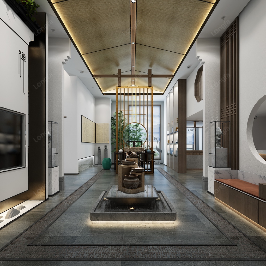 白色的墙壁、原木屋顶和装饰、青石地砖构成了会所大厅的主体风格,简约复古典雅。 厅内中央做了一个流动的泉水景观,潺潺的水流让人心归平静,感觉身心被净化。挑高的原木屋顶,让整个空间沉静、开阔。 设计师巧妙运用颇具代表性的中式镂空隔断,“移步换景”的效果,配合精雕细琢的装饰元素,达到中式风格中最为讲究的层次感。