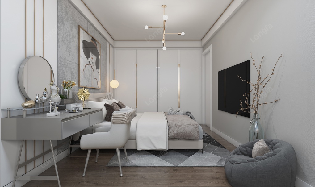 主卧作为居家休息的主要活动区域,以舒适和简约为主,背景墙以硬包和装饰板结合,搭配灰色墙漆,营造出舒适简单的睡眠空间。