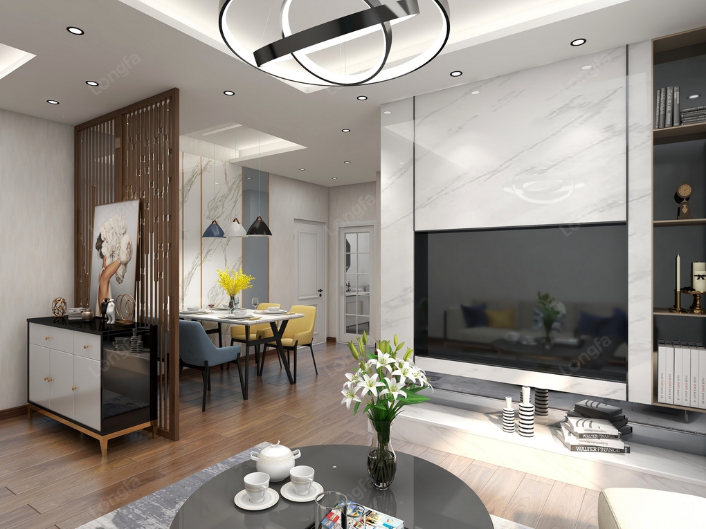 整个客厅以简洁明亮为主,大理石电视背景墙提升生活品质,墨绿色窗帘点缀解决客厅大面冷色调问题