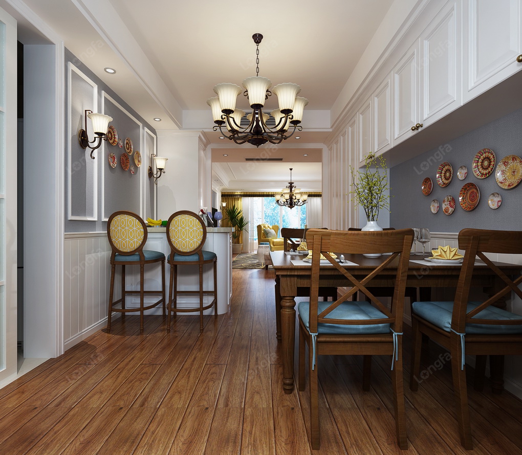 以实木材料制作的餐桌及椅凳朴实而自然,细节处理十分考究,如流畅的桌面线条,桌面及椅子的纹理,都凸显着家居生活的品质感。餐桌旁边别具一格的陈列柜,实用美观。