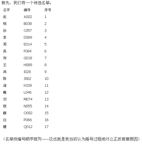 (我们知道,摇号编号由两部分组成(随机的第一部分+随机的第二部分,其实这也就为作弊提供了方便);为简单明了,这里的第一部分我就用一个顺序的字母代替了,第二部分仍旧是随机数字)